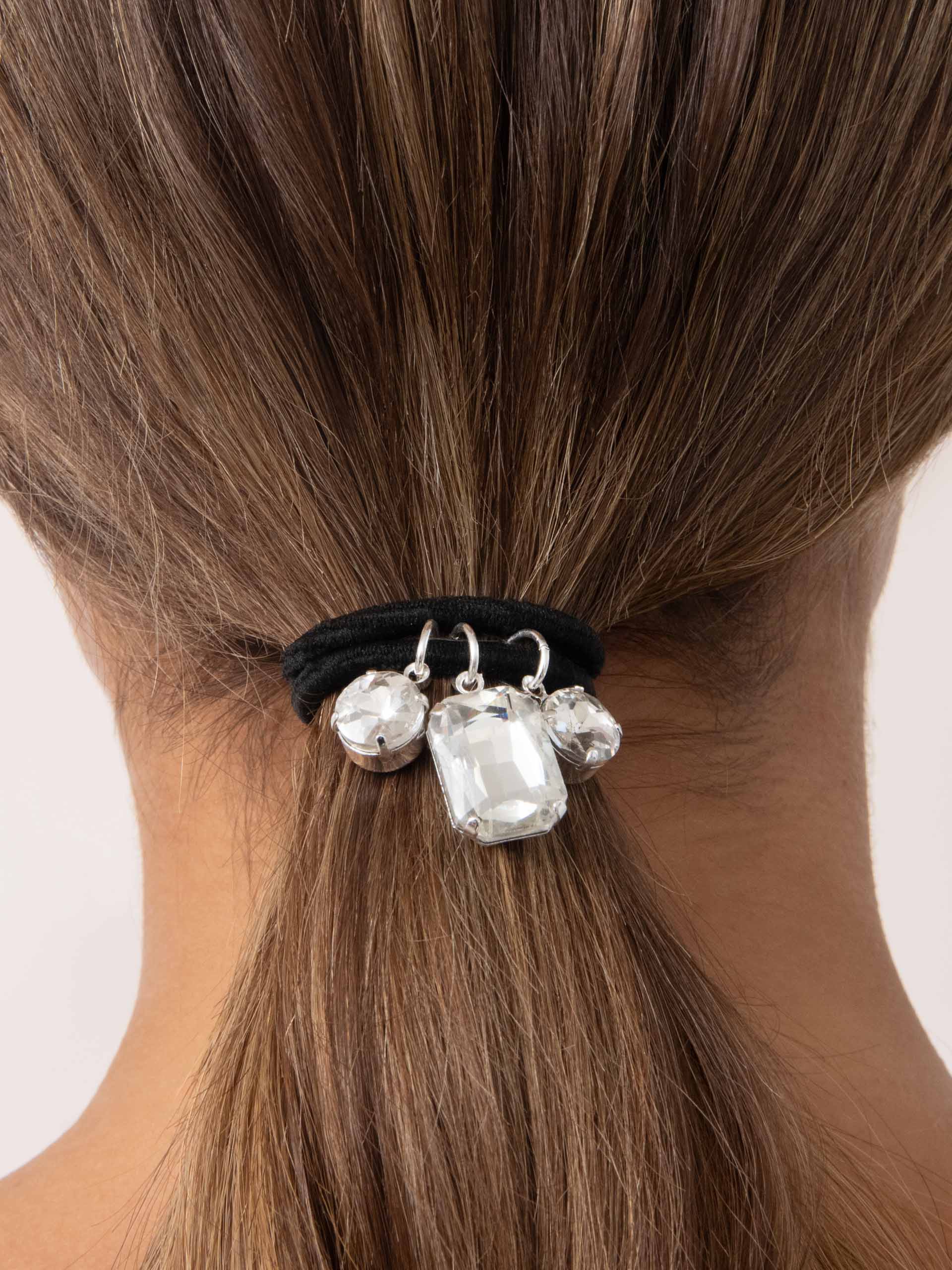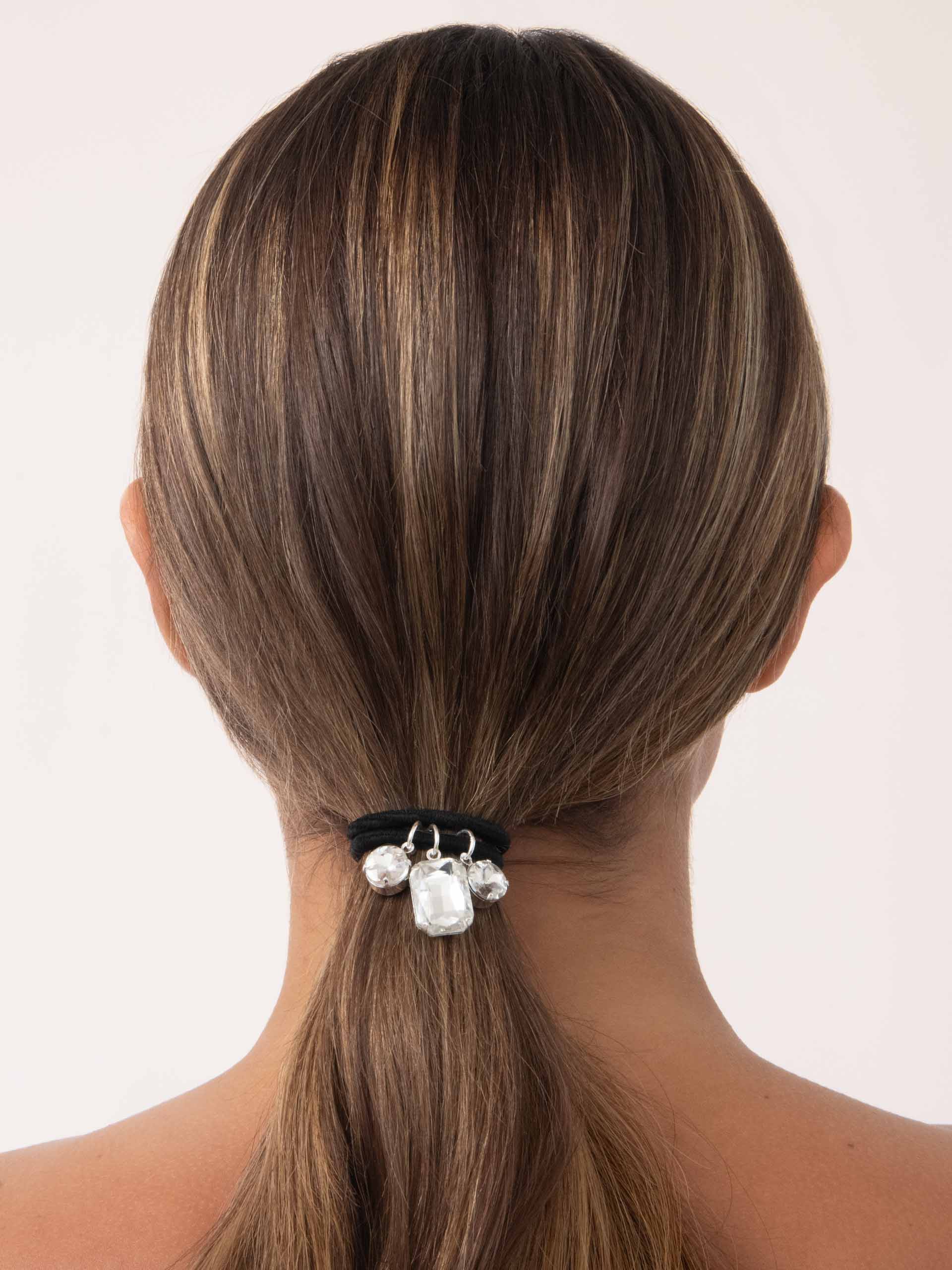 Crystal Dangle Hair Tie Silver with Black Elastic