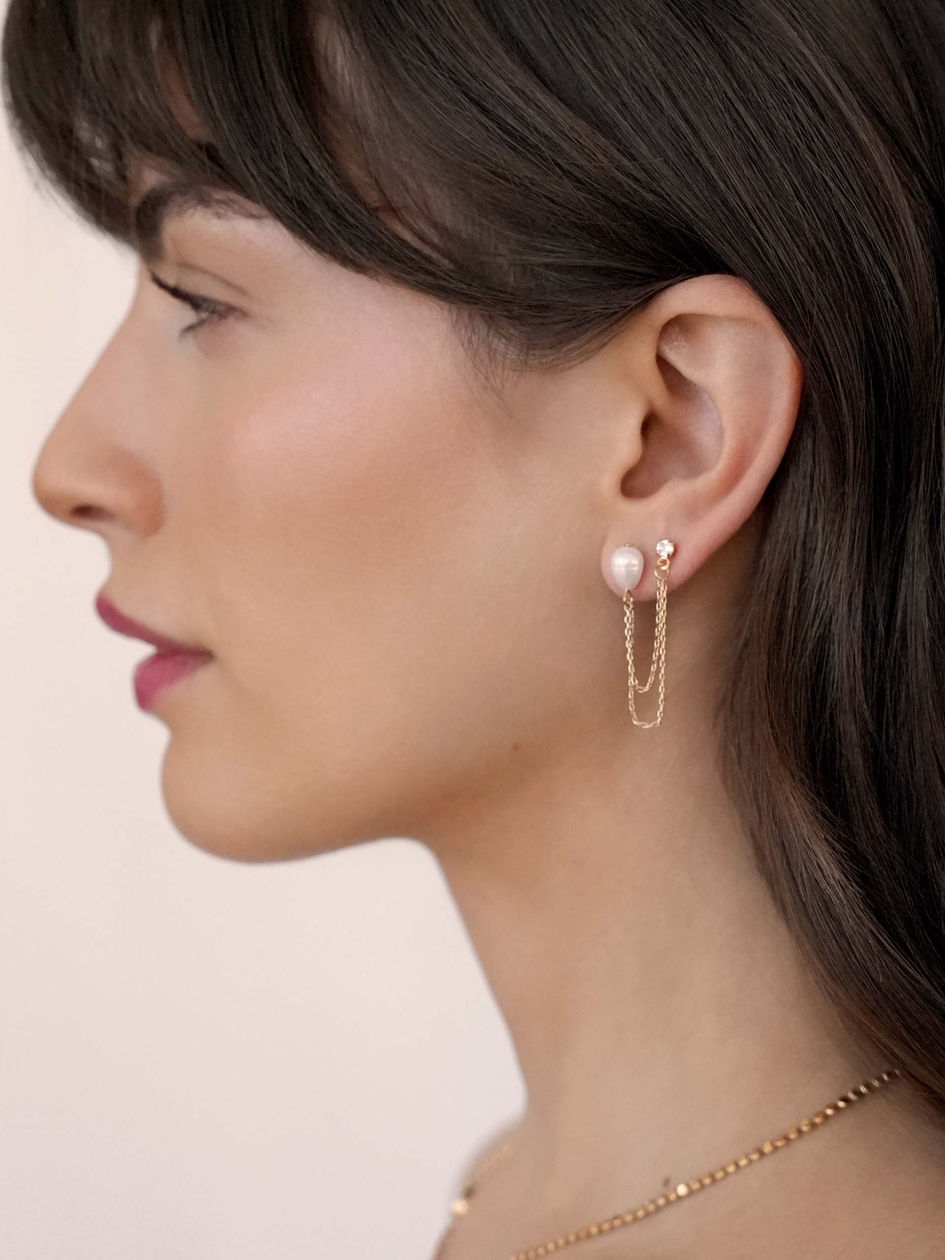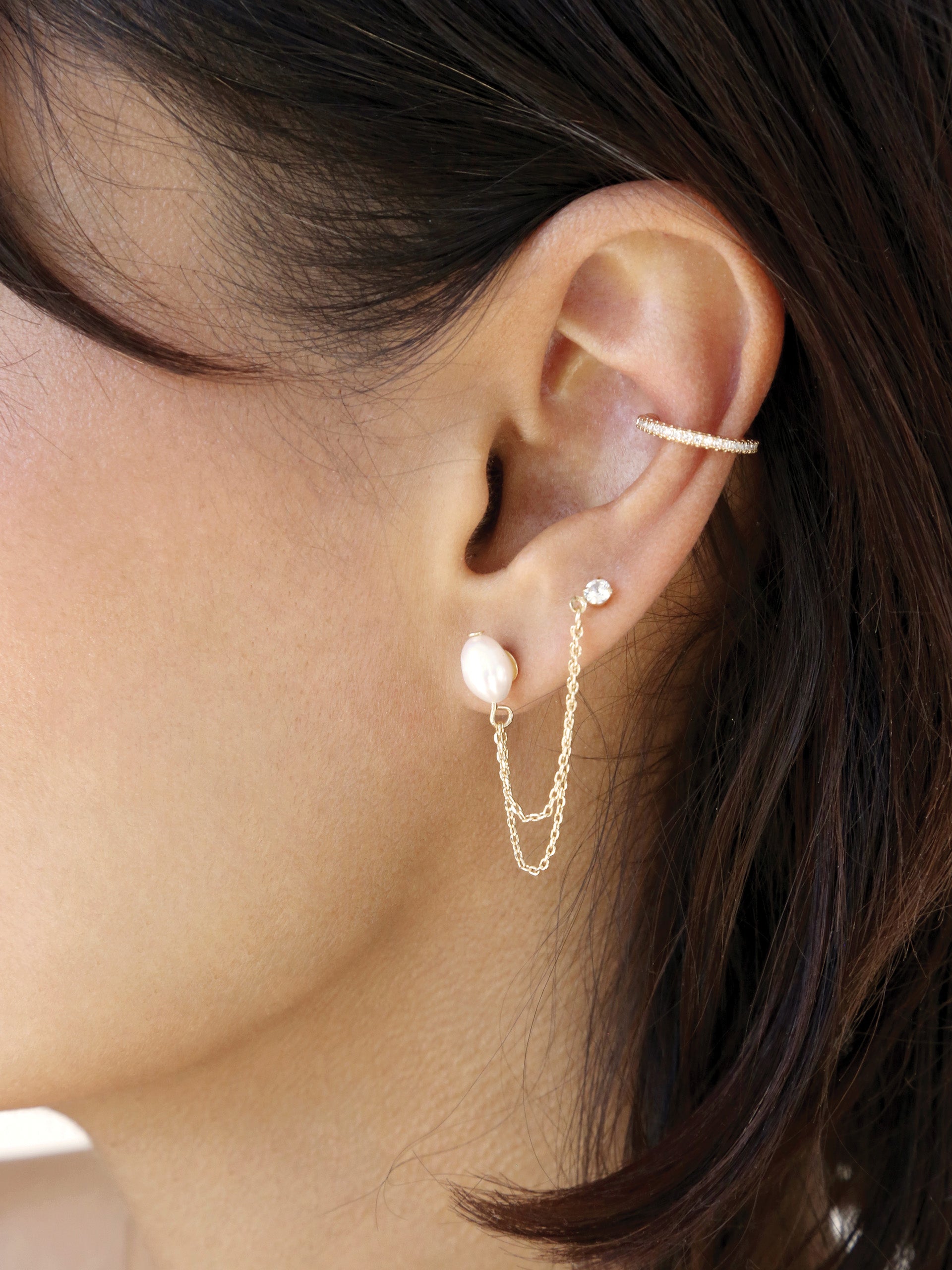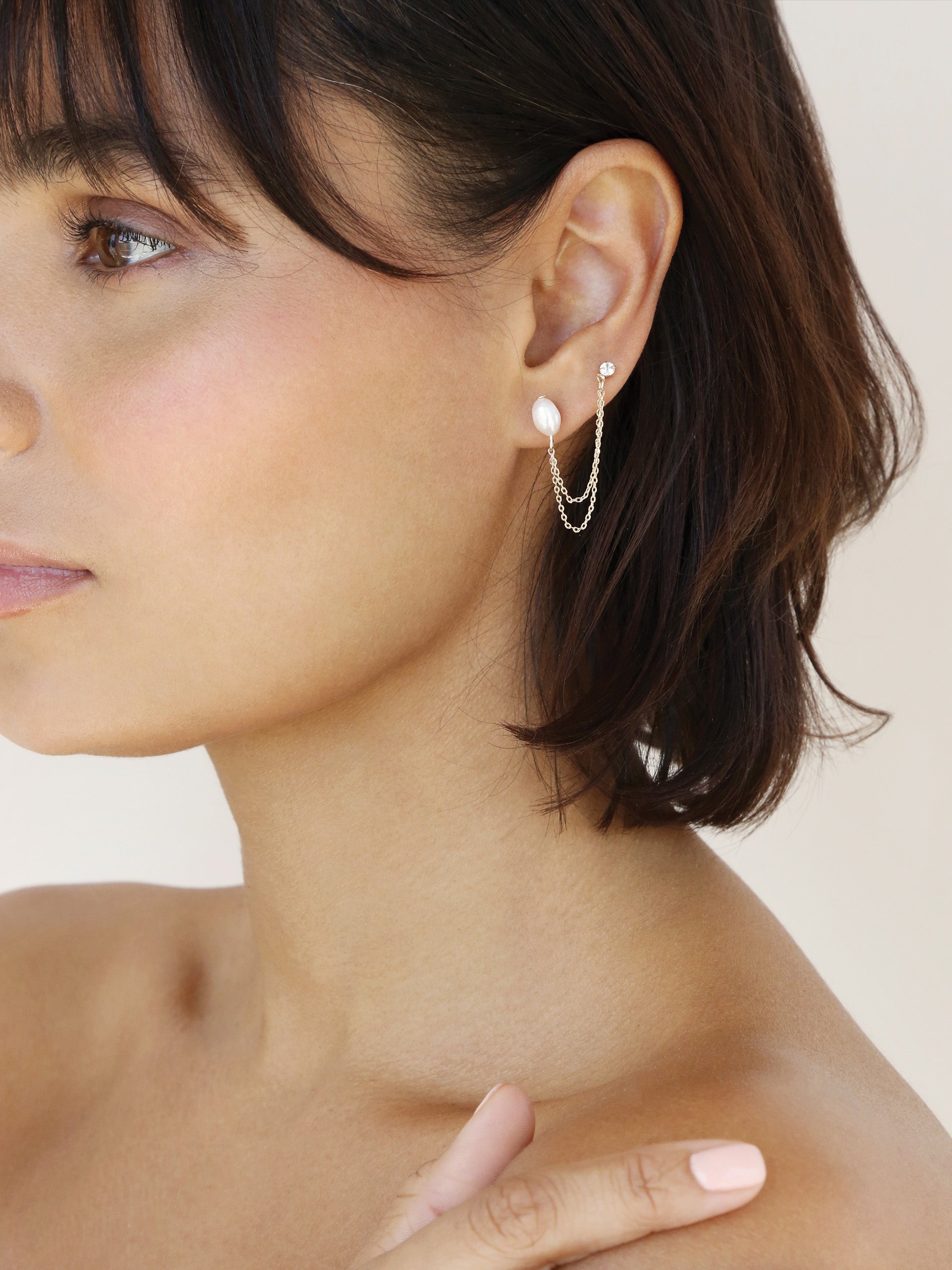 A graceful fusion of elegance and edge, this double piercing earring drapes delicate chains from luminous freshwater pearls.