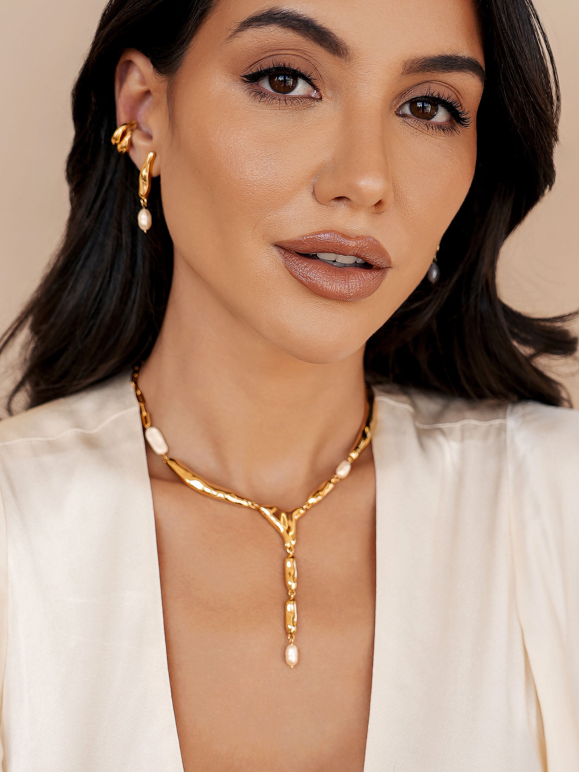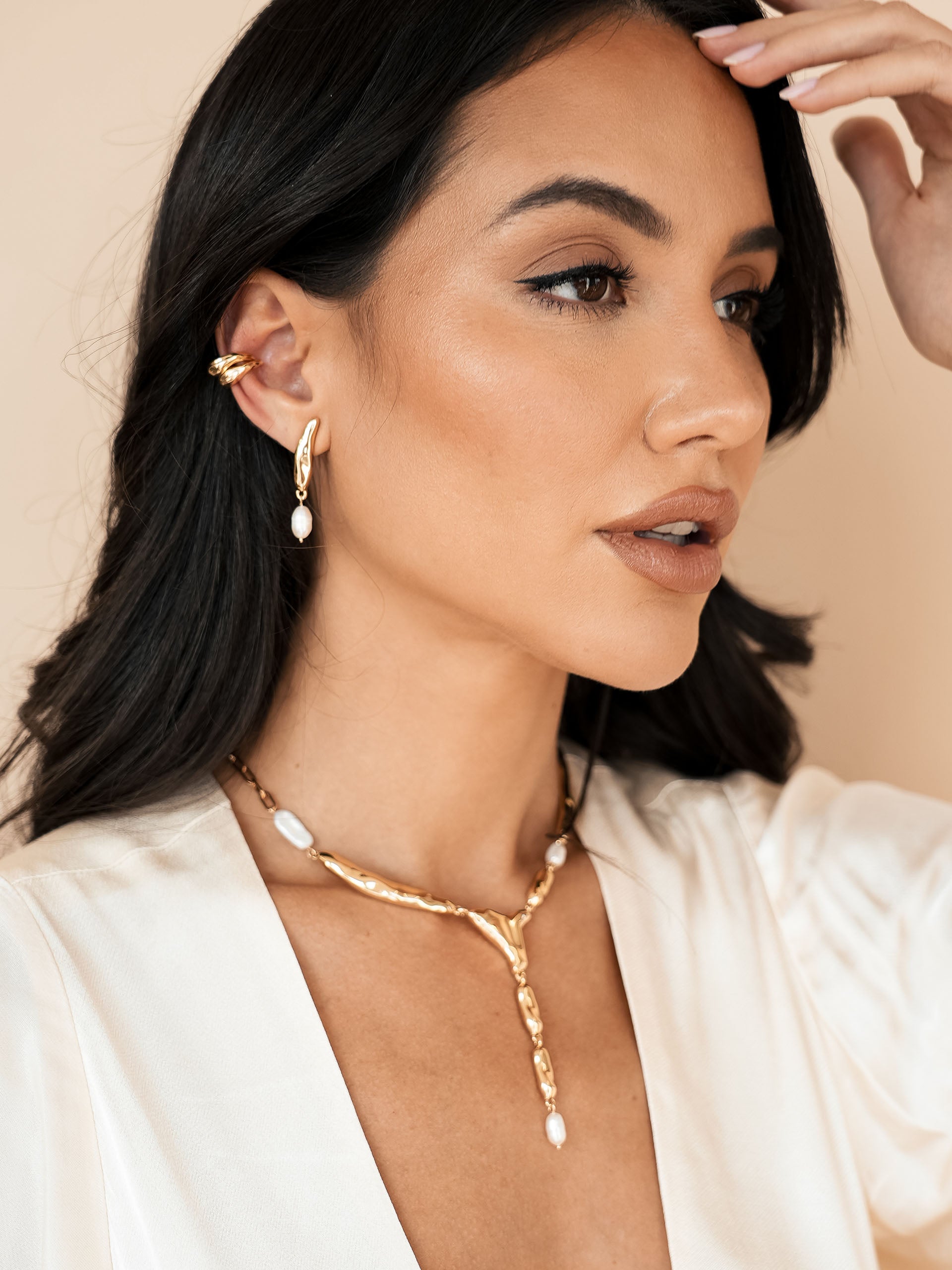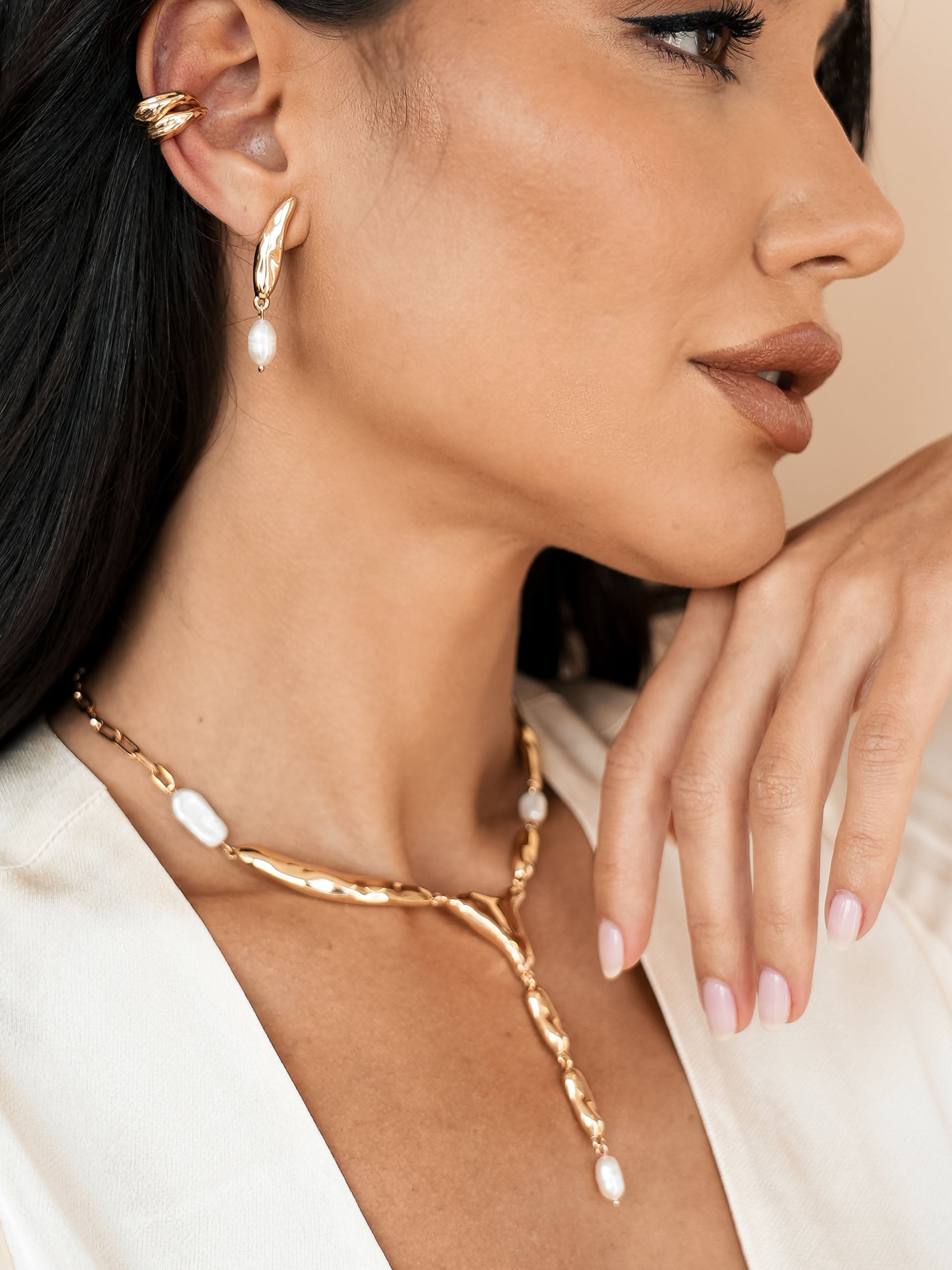 A mesmerizing mix of molten-inspired shine, the Liquid Luxe Earrings, Liquid Luxe Ear Cuff, and Liquid Melt and Pearl Necklace celebrate the art of imperfection. With flowing, organic shapes and lustrous pearl accents, this bundle captures the essence of liquid beauty—bold, feminine, and endlessly captivating.