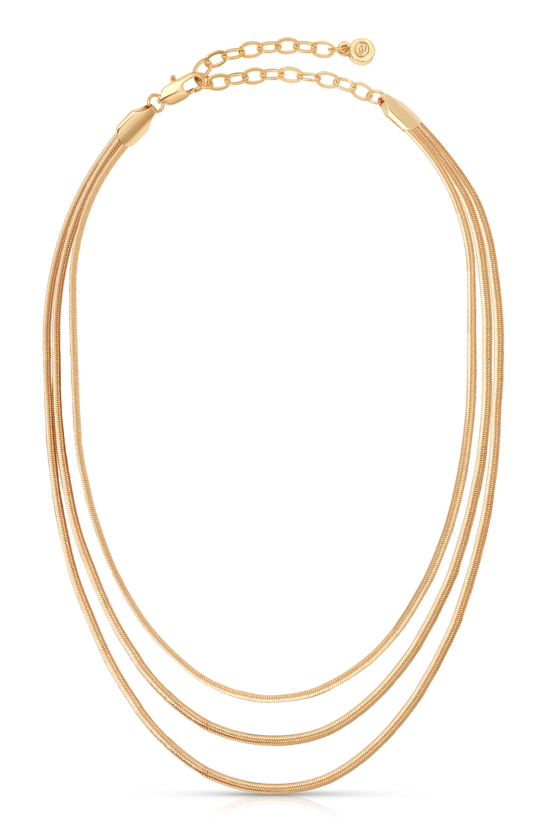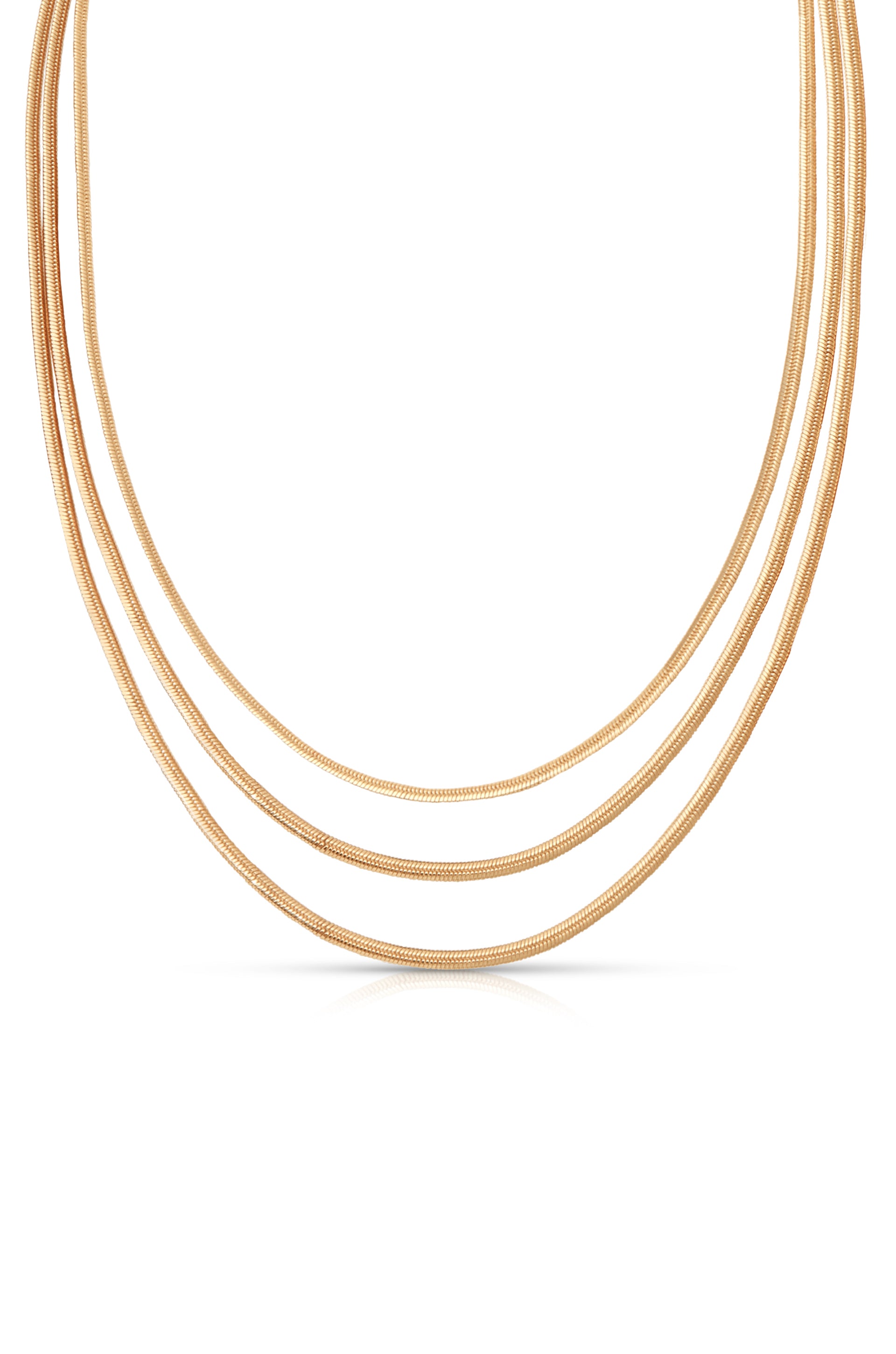 The Triple Snake Chain Necklace showcases three sleek, intertwined snake chains that create a stunning layered effect, adding a modern and sophisticated touch to any outfit.