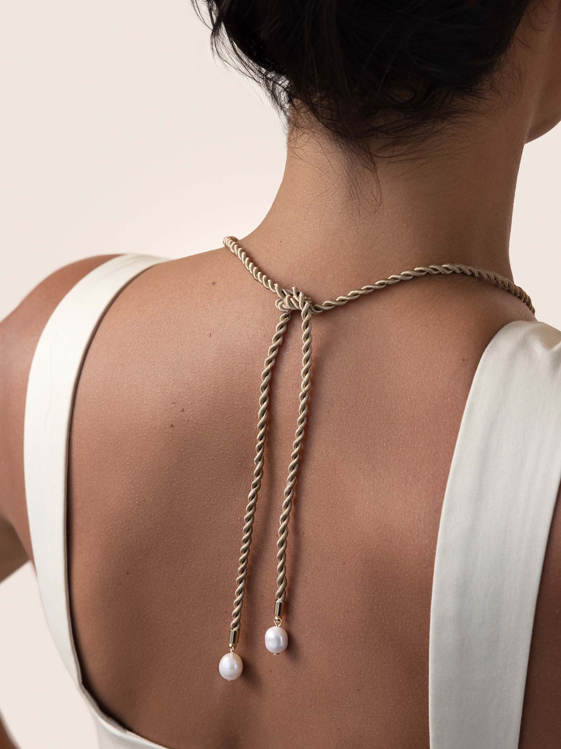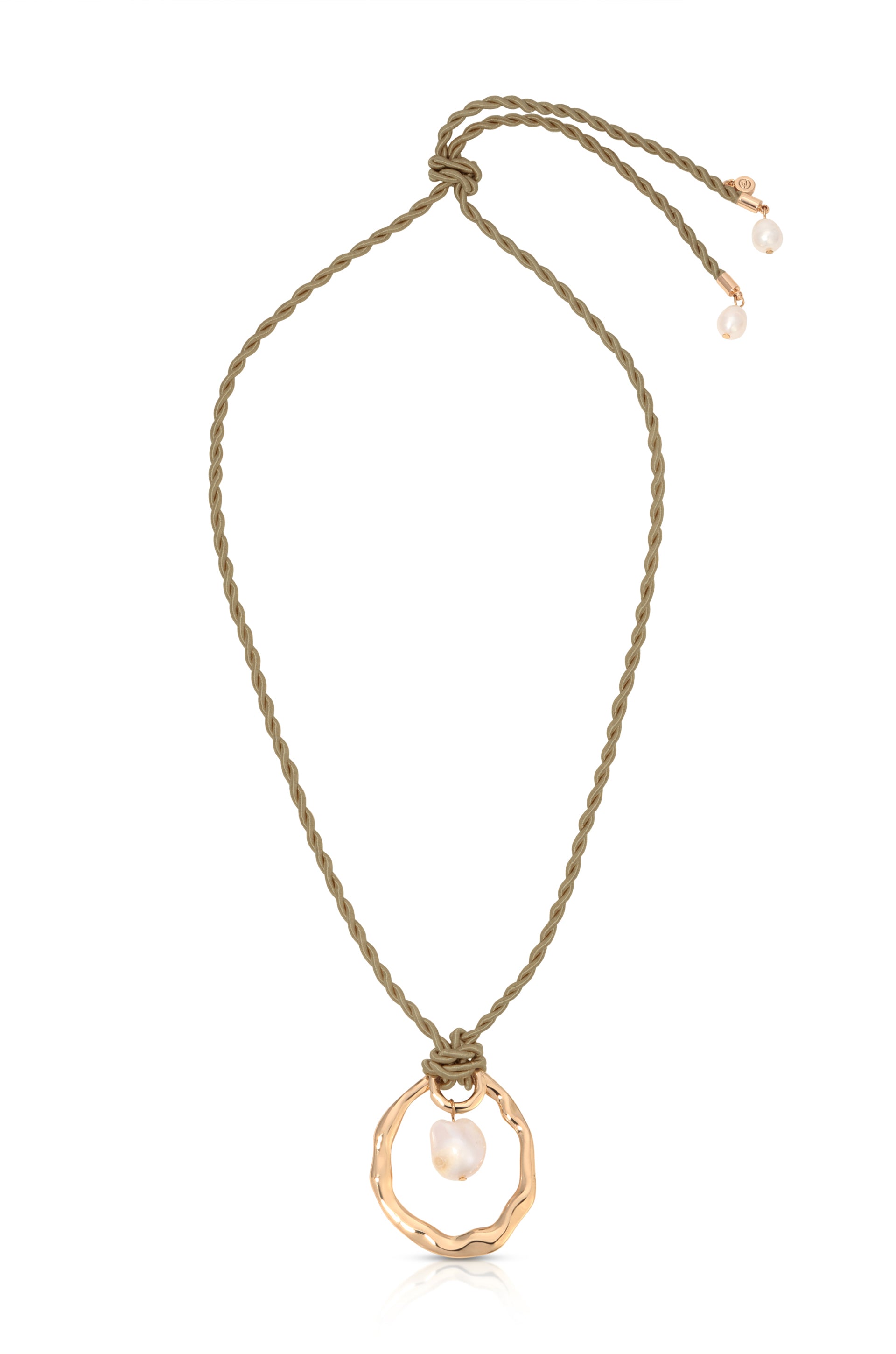 The Nautical Pearl Necklace showcases a unique baroque and freshwater pearl pendant, suspended on a smooth rope cord. A nod to the sea, it combines rustic charm with elegant, organic beauty.
