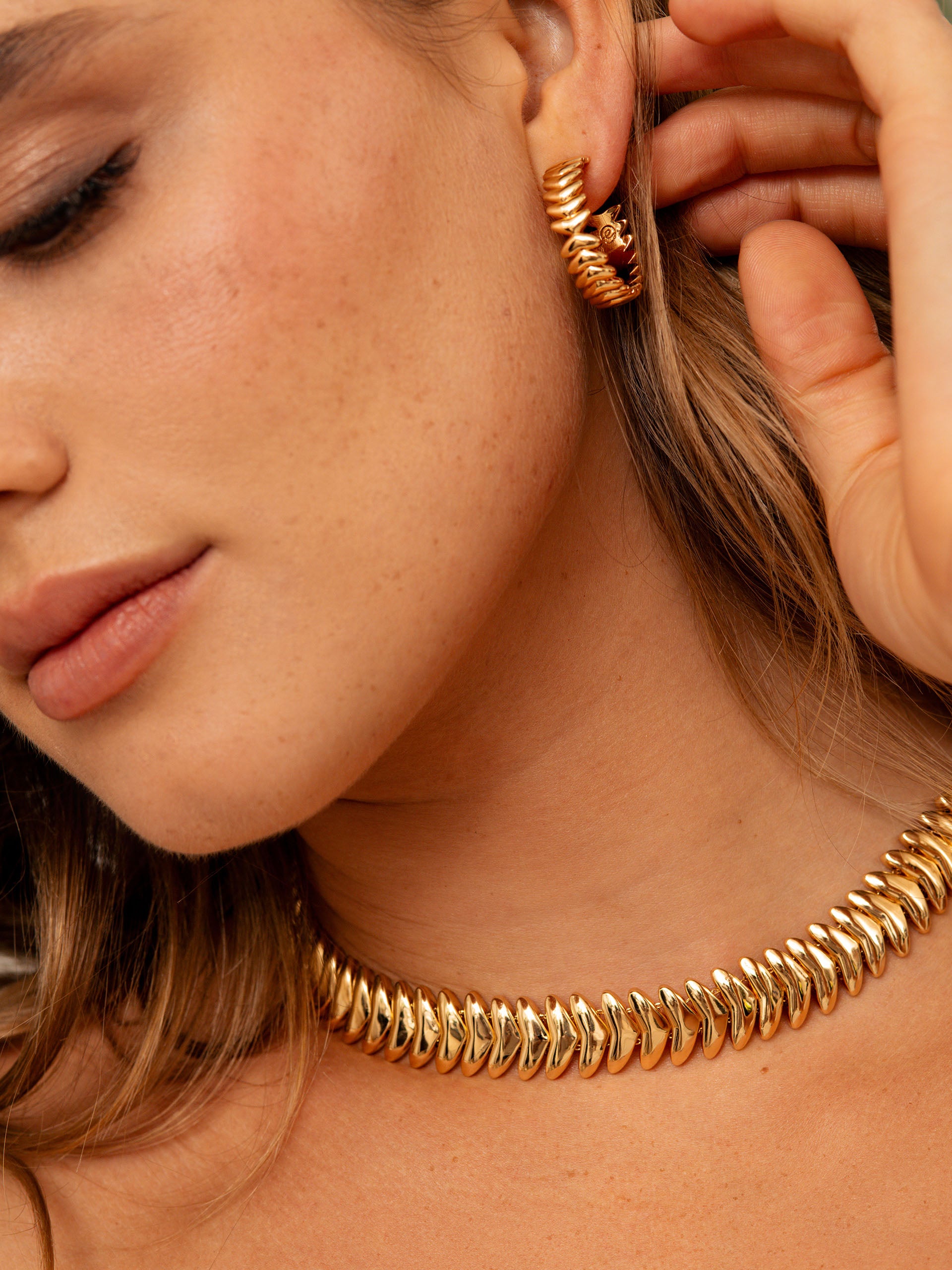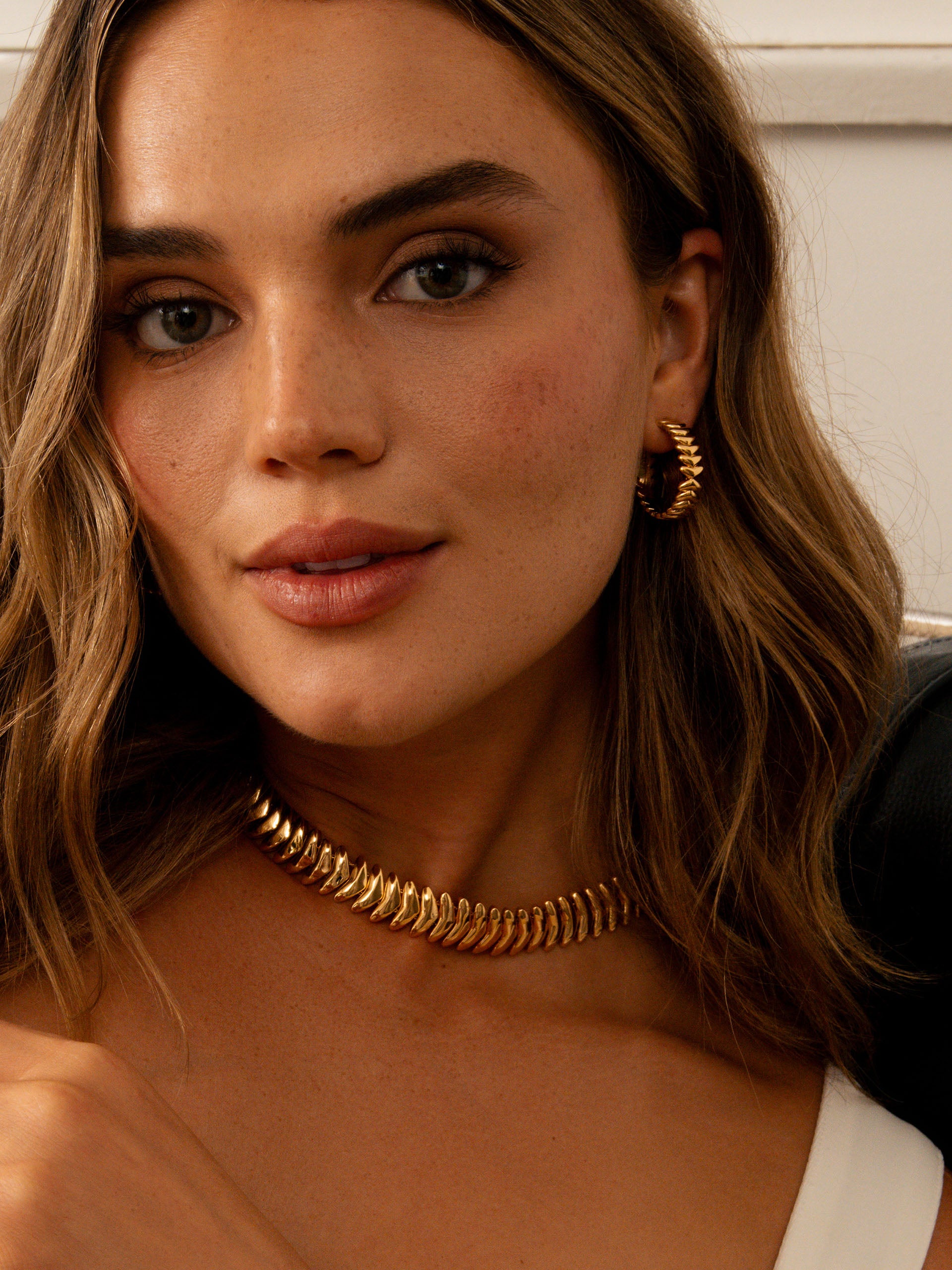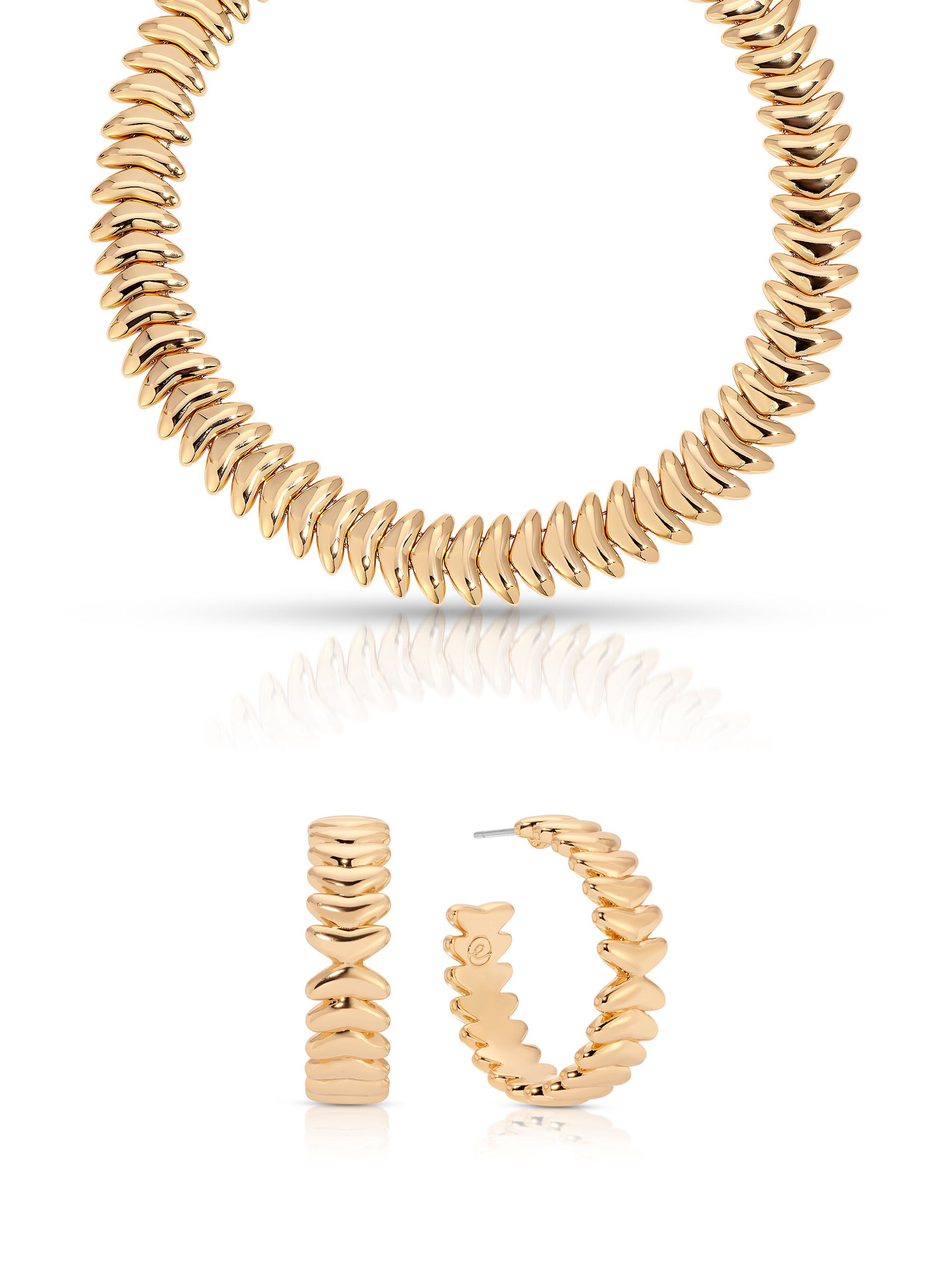 The Metal Moderna Necklace and Hoops unite bold metalwork with a sleek, contemporary edge. Inspired by the spirit of Americana, this bundle redefines the classic with sculptural shine—crafted for those who blend heritage with modern style.