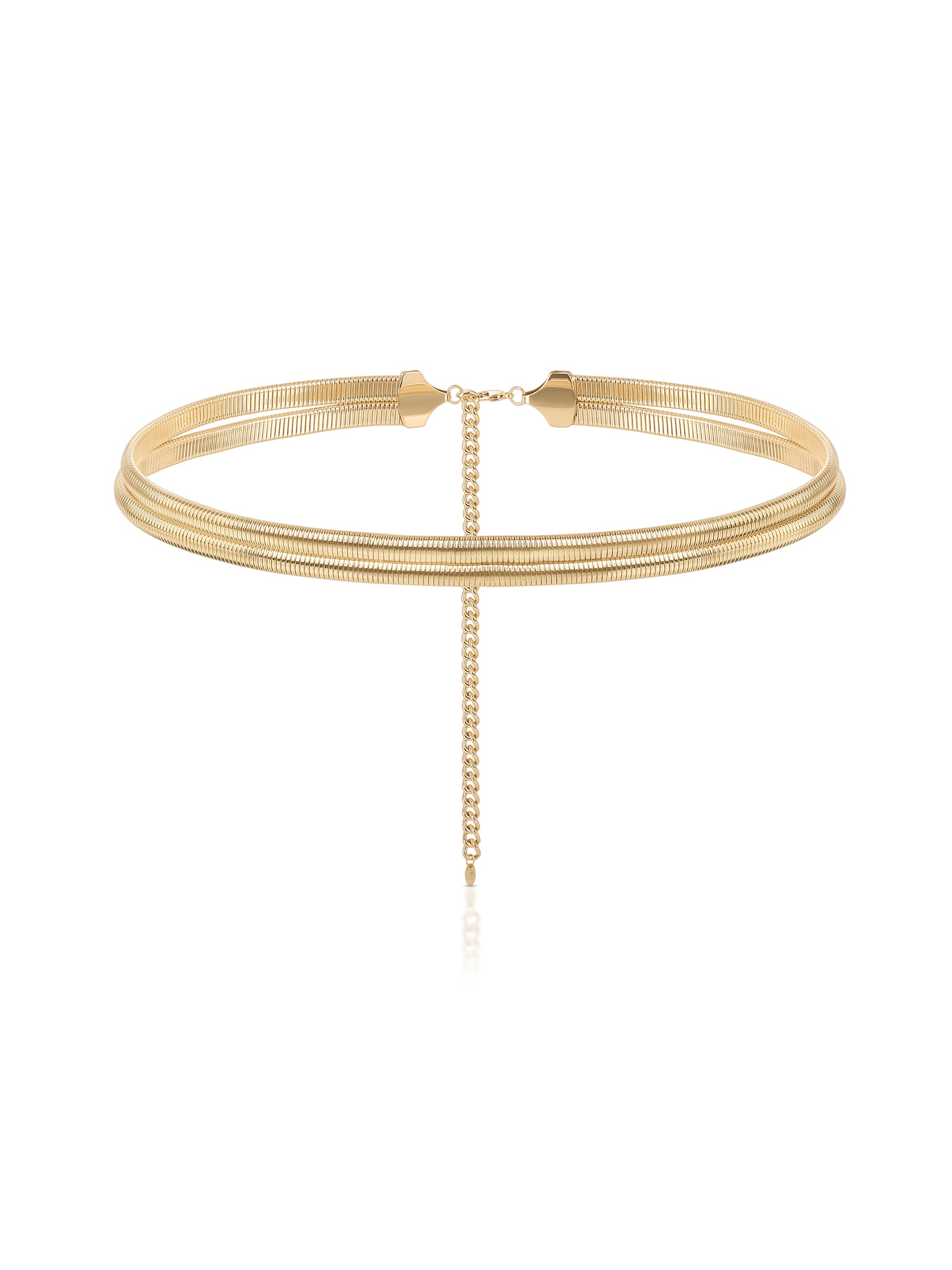 The Wrap Around Flex Snake Chain Belt features a versatile design that wraps elegantly around the waist, crafted from flexible snake chains. This belt can also be worn as a choker by being wrapped around the neckline multiple times for a dramatic, stacked look.