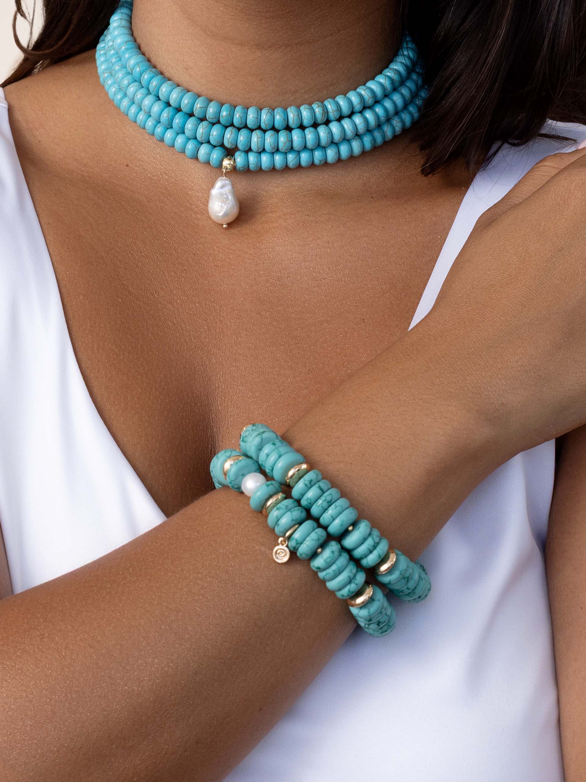 Bring in natural elements that make your closet feel premium. A new take on everyday turquoise, this collection features smooth, hand-polished stones paired with brilliant crystal accents for a touch of refined sparkle. Each stone is hand set and metal is all hand polished giving every piece a rich, luminous finish. Designed for versatility, these styles can be stacked or worn solo—effortlessly transitioning from casual days to dressed-up occasions with modern ease.