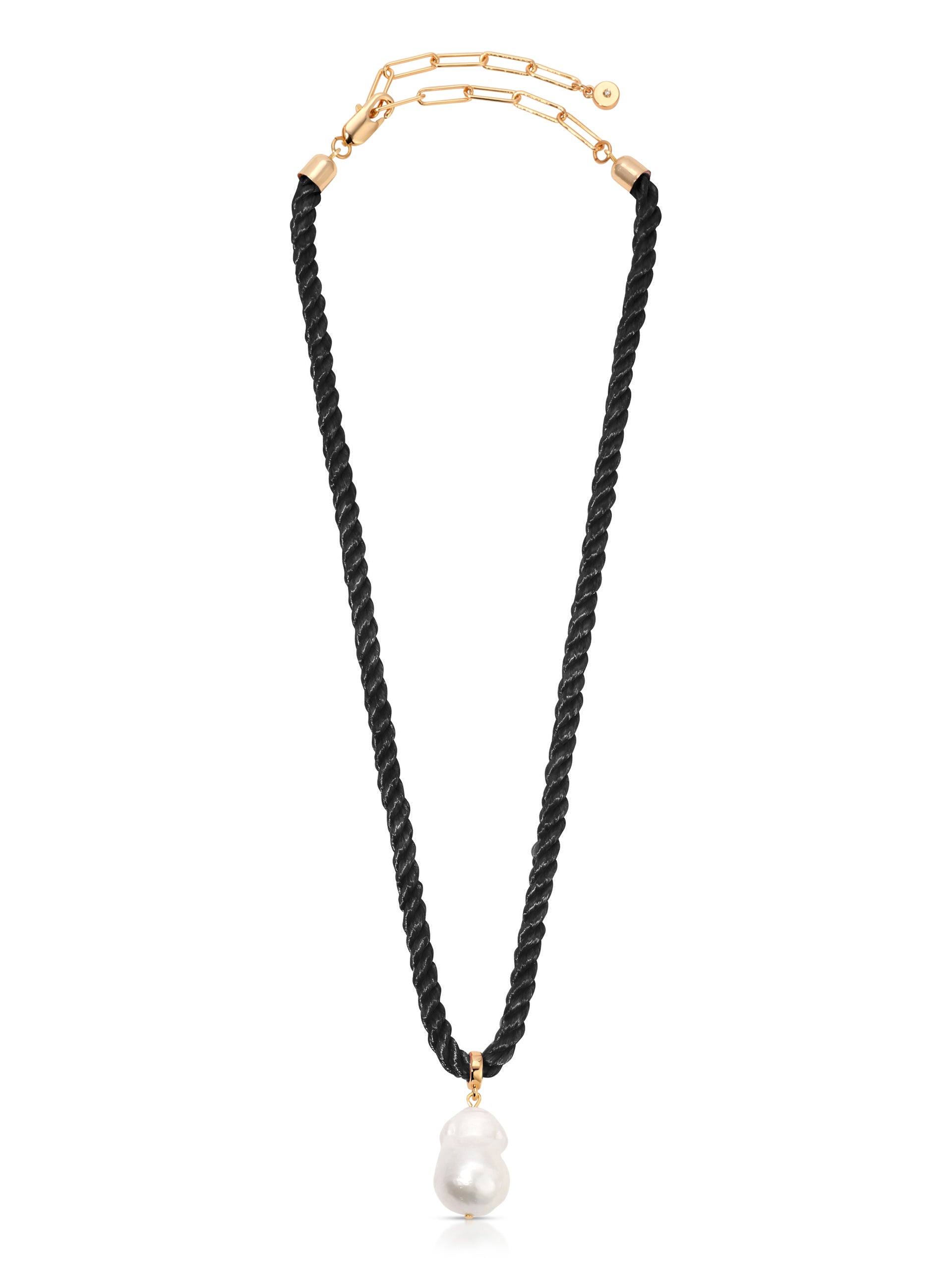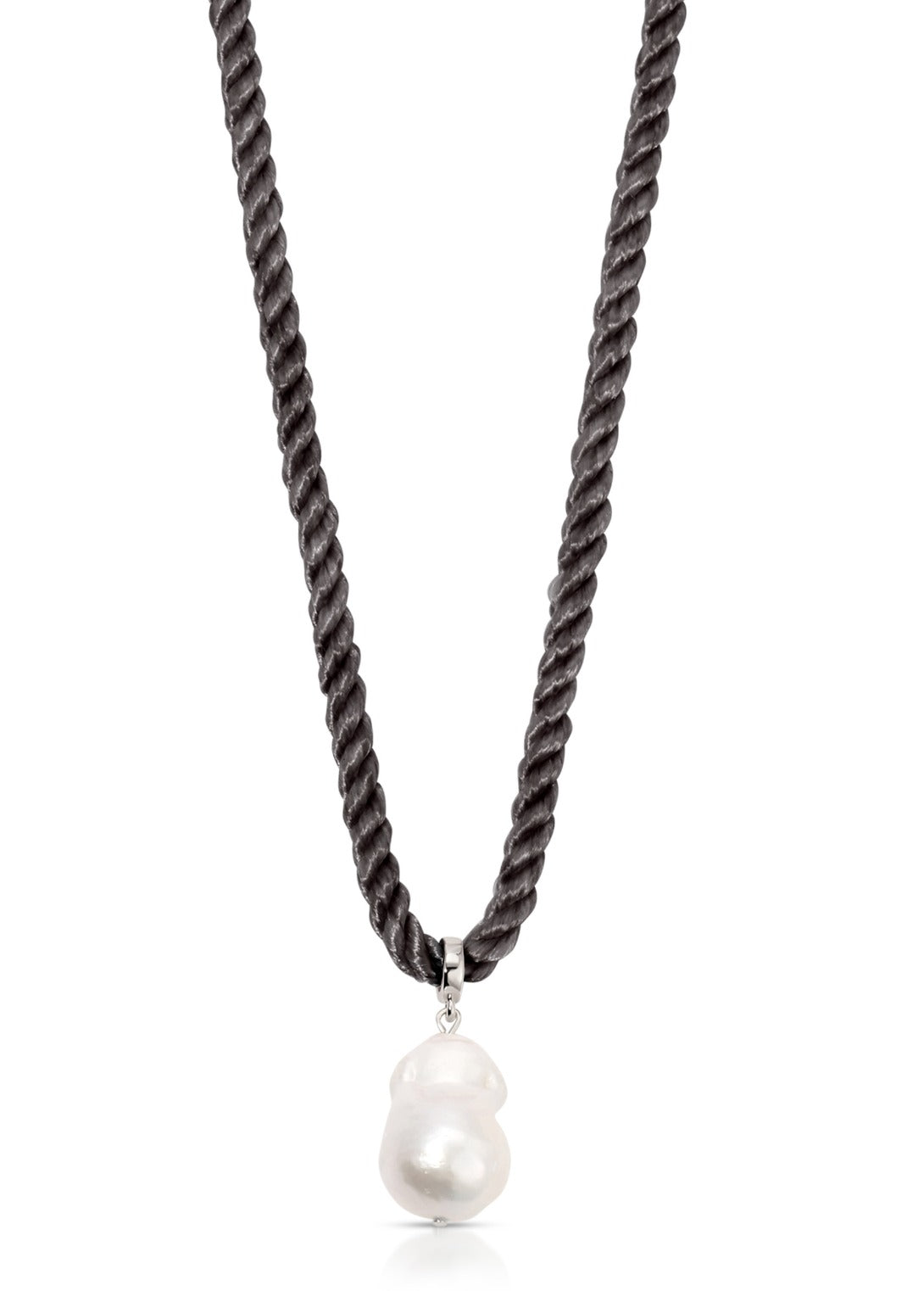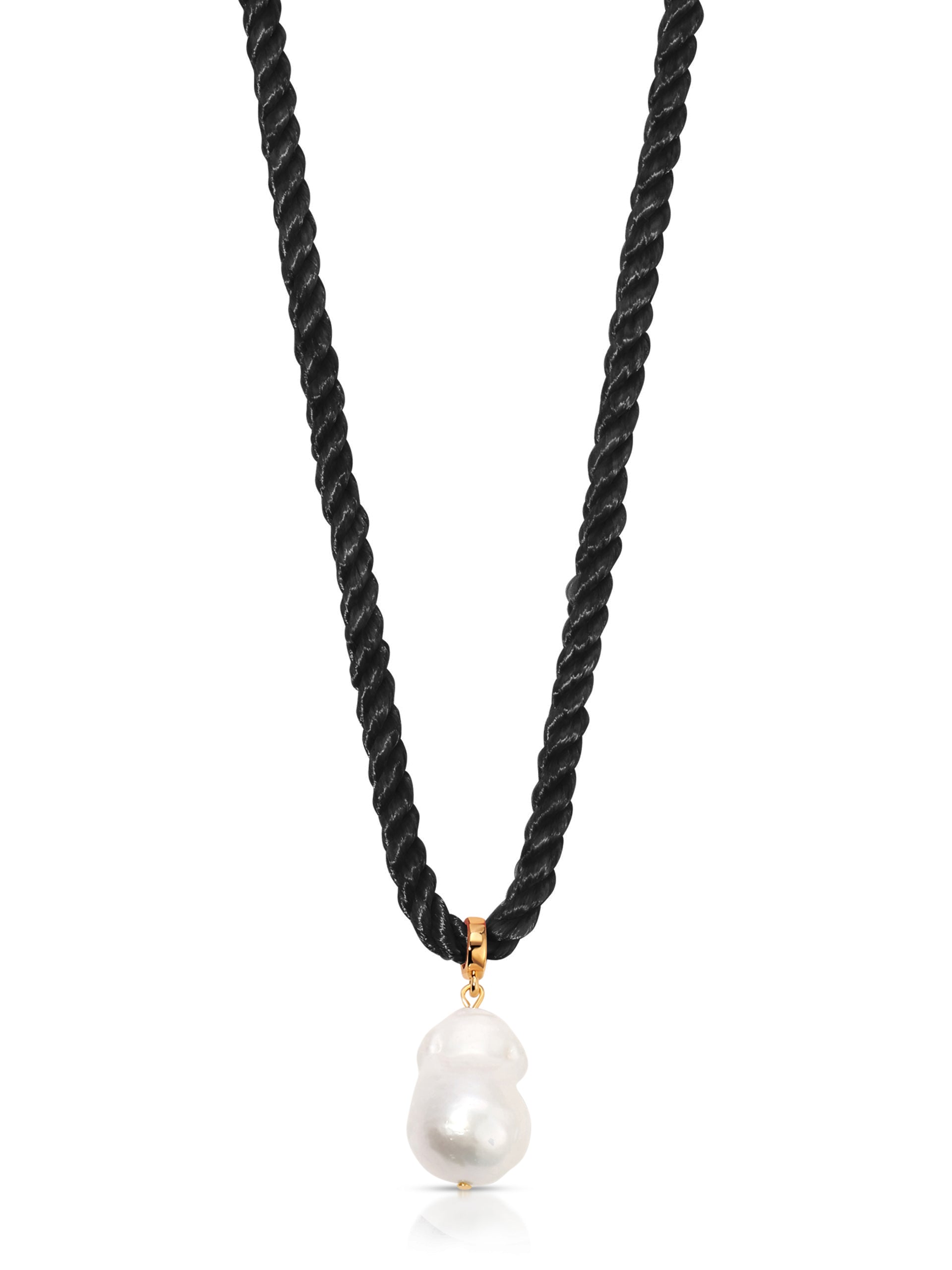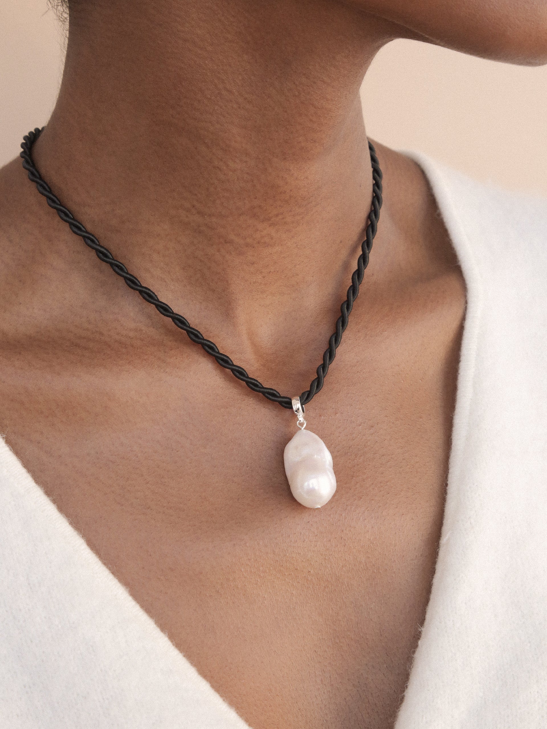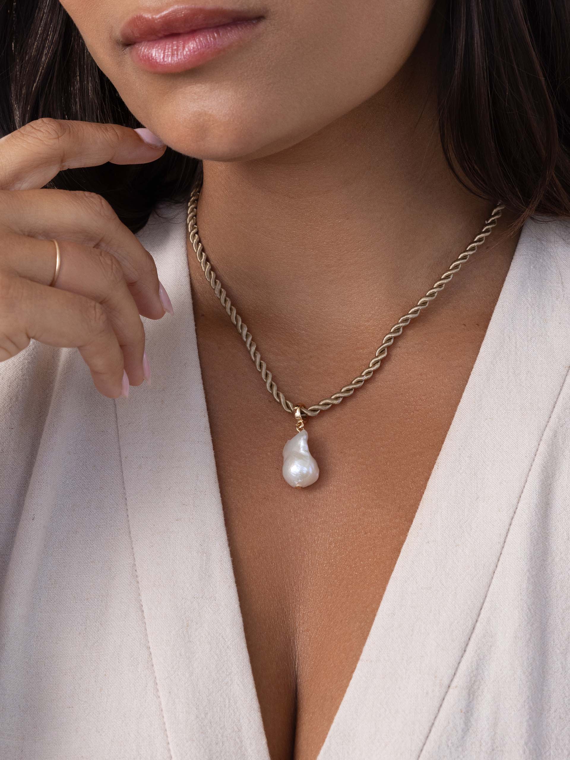 The Freshwater Token Necklace showcases a striking large freshwater pearl pendant, suspended gracefully on a luxurious silk cord. Simple yet elegant, it’s a modern tribute to nature’s finest treasures.