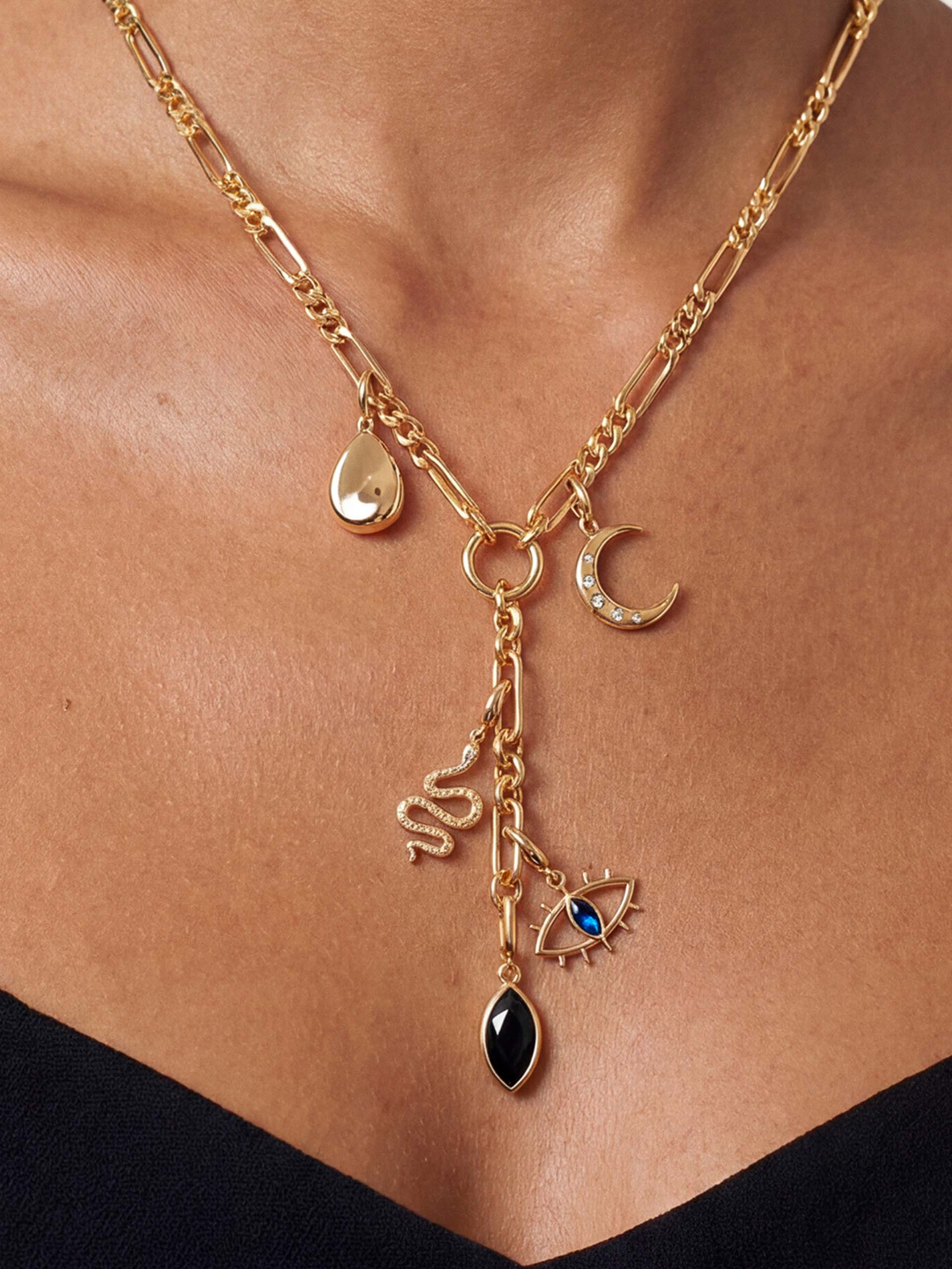 Anchored by a paperclip chain lariat, the Midnight Charm Lariat Necklace is crafted in 18k gold plating and finished with five symbolic charms that shimmer after dark. Crescent moons, protective eyes, and deep-hued stones come together to channel intuition, power, and allure.