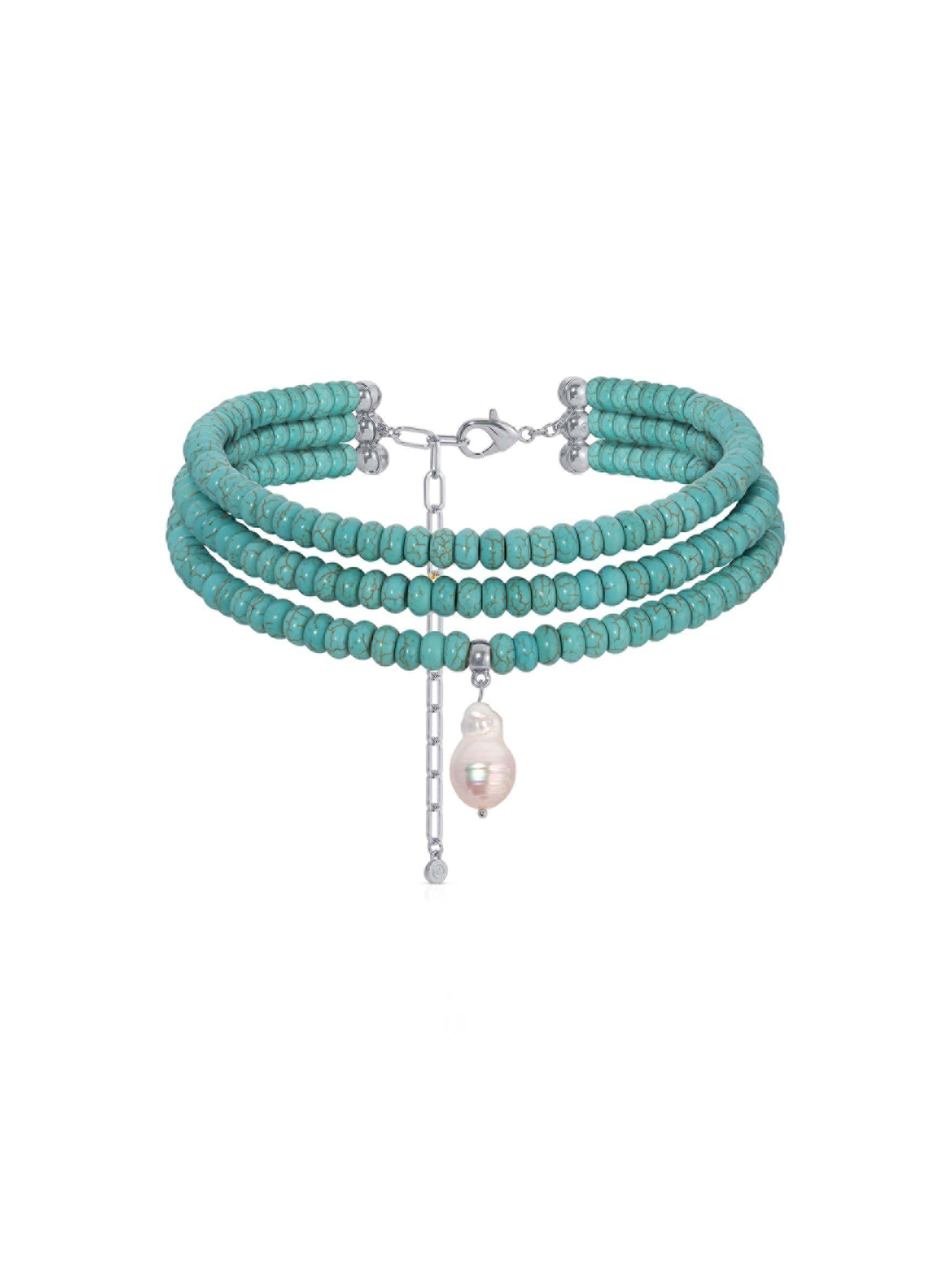 Our reconstituted turquoise is versatile and can build several looks. The lustre of a genuine, freshwater pearl against this shade creates a breathtaking moment.